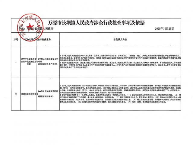 2025年万源市长坝镇人民政府涉企行政检查事项及依据