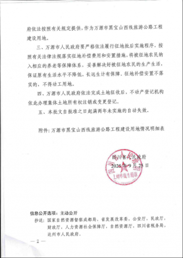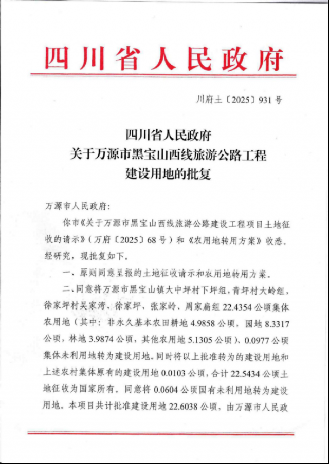 具体详见《四川省人民政府关于万源市黑宝山西线旅游公路工程建设用地的批复》(川府土〔2025〕931号),附后。