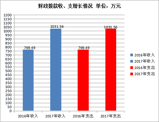 2017年度财政拨款收、支总计1031.56万元。与2016年相比,财政拨款收、支总计各增加242.15万元,增长30.67%。