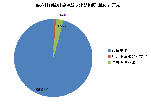 2017年一般公共预算财政拨款支出1031.56万元,主要用于以下方面:一般公共服务支出0万元,占0%;教育支出993.54万元,占96.31%;社会保障和就业支出5.68万元,占0.55%;医疗卫生支出0万元,占0%;住房保障支出32.34万元,占3.14%。